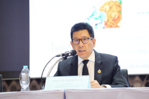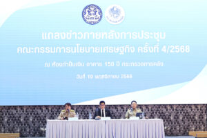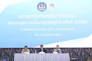 ดร.เอกนิติ นิติทัณฑ์ประภาศ รองนายกรัฐมนตรีและรัฐมนตรีว่าการกระทรวงการคลัง พร้อมด้วยนายสิริพงศ์ อังคสกุลเกียรติ โฆษกประจำสำนักนายกรัฐมนตรี และนายลวรณ แสงสนิท ปลัดกระทรวงการคลัง แถลงข่าวภายหลังการประชุม คณะกรรมการนโยบายเศรษฐกิจ ครั้งที่ 4/2568 ณ ห้องกำปั่นเงิน อาคาร 150 ปี กระทรวงการคลัง เมื่อวันที่ 10 พฤศจิกายน 2568