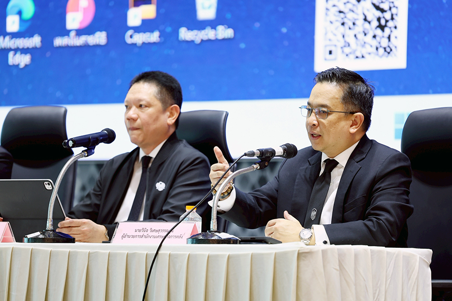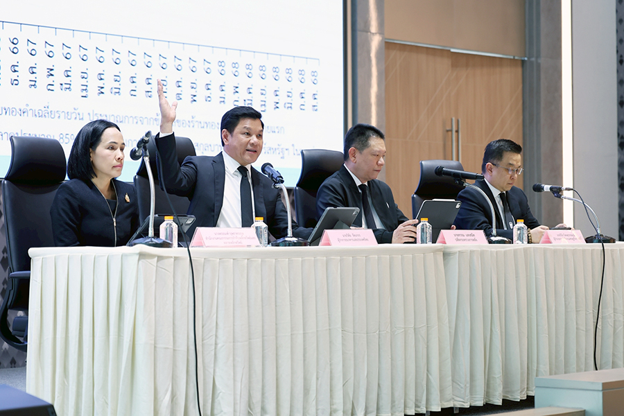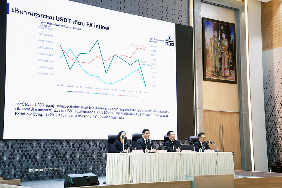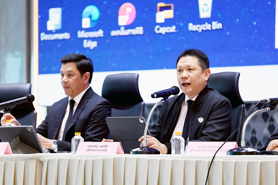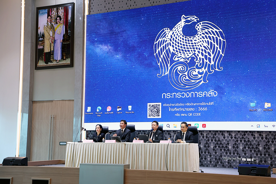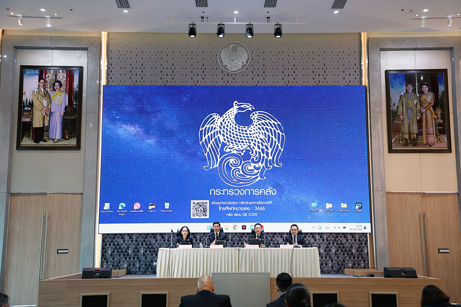 นายลวรณ แสงสนิท ปลัดกระทรวงการคลัง พร้อมด้วย นายวินิจ วิเศษสุวรรณภูมิ ผู้อำนวยการสำนักงานเศรษฐกิจการคลัง นายวิทัย รัตนากร ผู้ว่าการธนาคารแห่งประเทศไทย และนางพรอนงค์ บุษราตระกูล เลขาธิการสำนักงานคณะกรรมการกำกับหลักทรัพย์และตลาดหลักทรัพย์ ร่วมแถลงข่าวแนวทางการบริหารจัดการสถานการณ์ค่าเงินบาทในปัจจุบัน เพื่อติดตามสถานการณ์และกำหนดแนวทางรองรับสถานการณ์ค่าเงินบาทที่มีแนวโน้มแข็งค่าขึ้นอย่างต่อเนื่อง ณ ห้องประชุมกำปั่นเงิน ชั้น 21 อาคาร 150 ปี กระทรวงการคลัง เมื่อวันที่ 24 ธันวาคม 2568