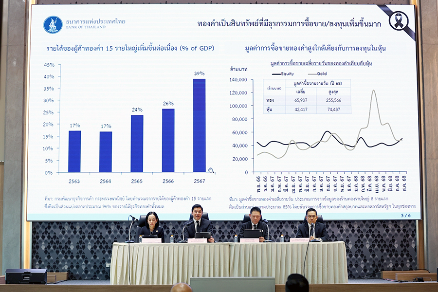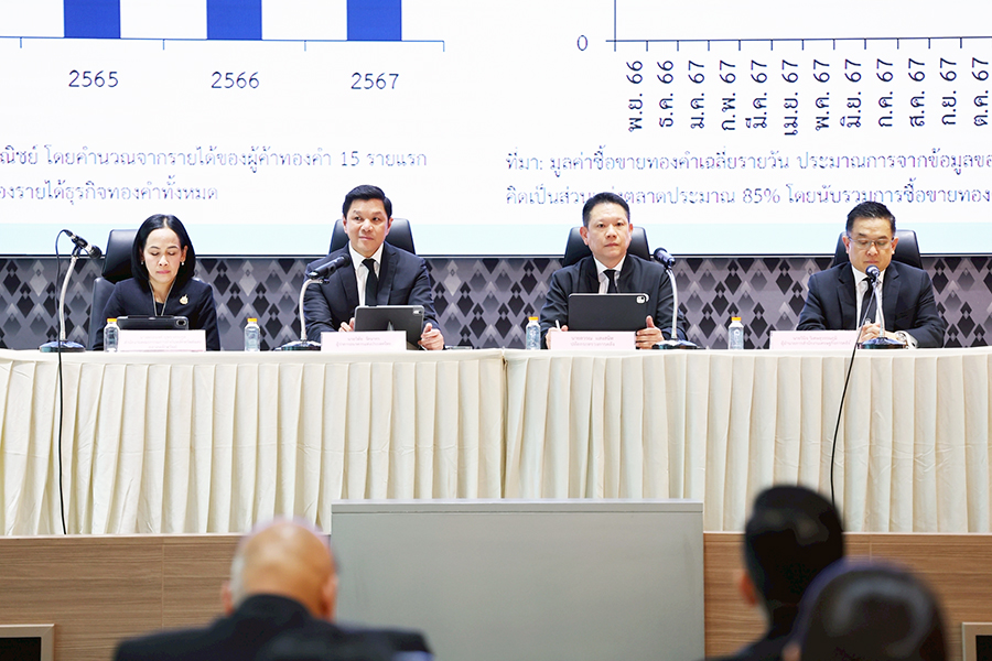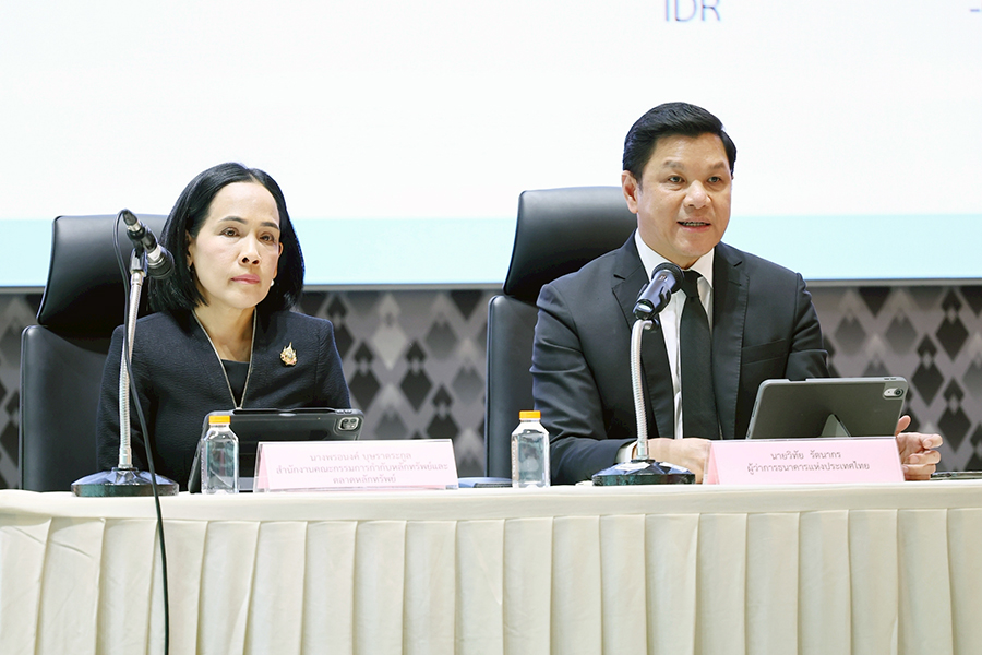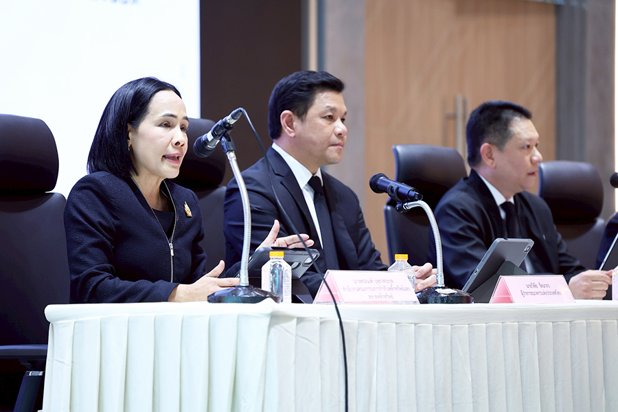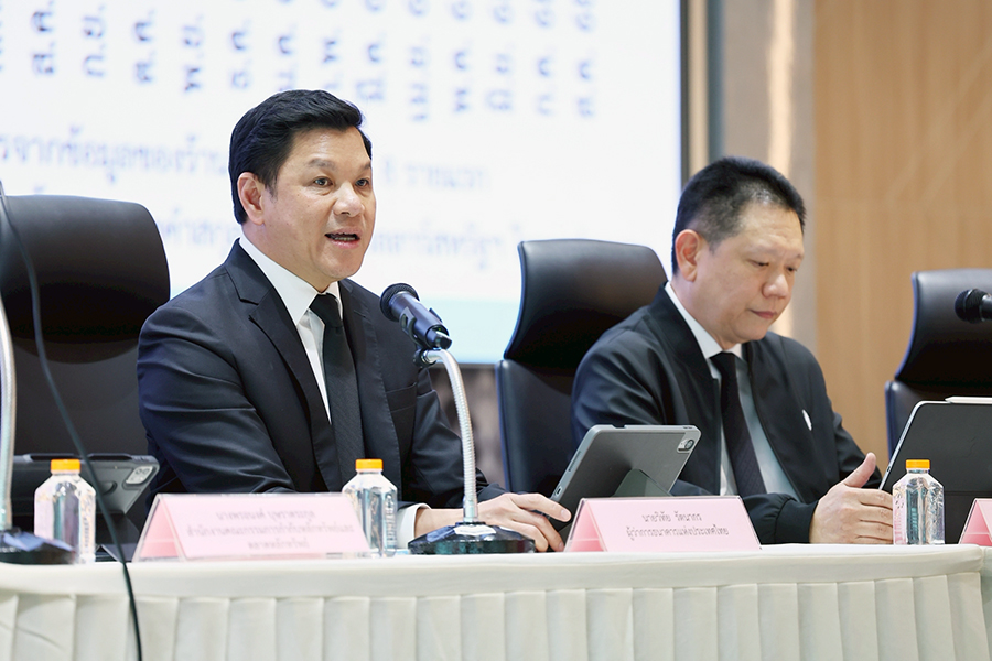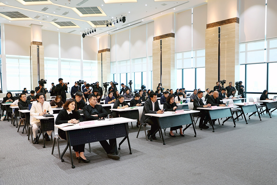 นายลวรณ แสงสนิท ปลัดกระทรวงการคลัง พร้อมด้วย นายวินิจ วิเศษสุวรรณภูมิ ผู้อำนวยการสำนักงานเศรษฐกิจการคลัง นายวิทัย รัตนากร ผู้ว่าการธนาคารแห่งประเทศไทย และนางพรอนงค์ บุษราตระกูล เลขาธิการสำนักงานคณะกรรมการกำกับหลักทรัพย์และตลาดหลักทรัพย์ ร่วมแถลงข่าวแนวทางการบริหารจัดการสถานการณ์ค่าเงินบาทในปัจจุบัน เพื่อติดตามสถานการณ์และกำหนดแนวทางรองรับสถานการณ์ค่าเงินบาทที่มีแนวโน้มแข็งค่าขึ้นอย่างต่อเนื่อง ณ ห้องประชุมกำปั่นเงิน ชั้น 21 อาคาร 150 ปี กระทรวงการคลัง เมื่อวันที่ 24 ธันวาคม 2568