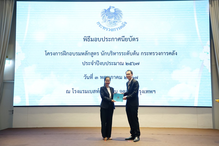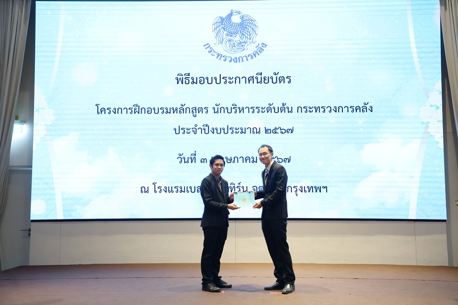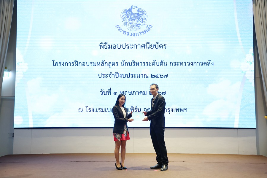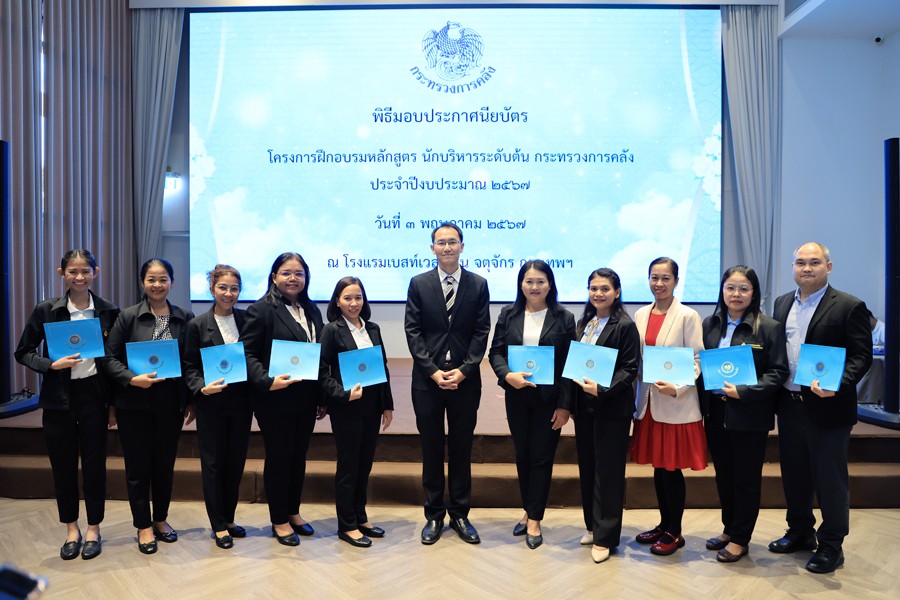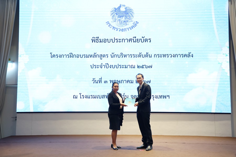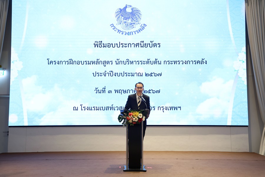 นายสิทธิรัตน์ ดรงคมาศ ผู้ช่วยปลัดกระทรวงการคลัง รักษาการในตำแหน่งที่ปรึกษาด้านเศรษฐกิจการคลัง สำนักงานเศรษฐกิจการคลัง เป็นประธานพิธีมอบประกาศนียบัตร โครงการฝึกอบรมหลักสูตร นักบริหารระดับต้น กระทรวงการคลัง ประจำปีงบประมาณ 2567 ณ โรงแรมเบสท์เวสเทิร์น จตุจัตร กรุงเทพฯ เมื่อวันที่ 3 พฤษภาคม 2567