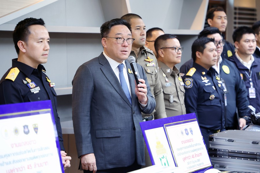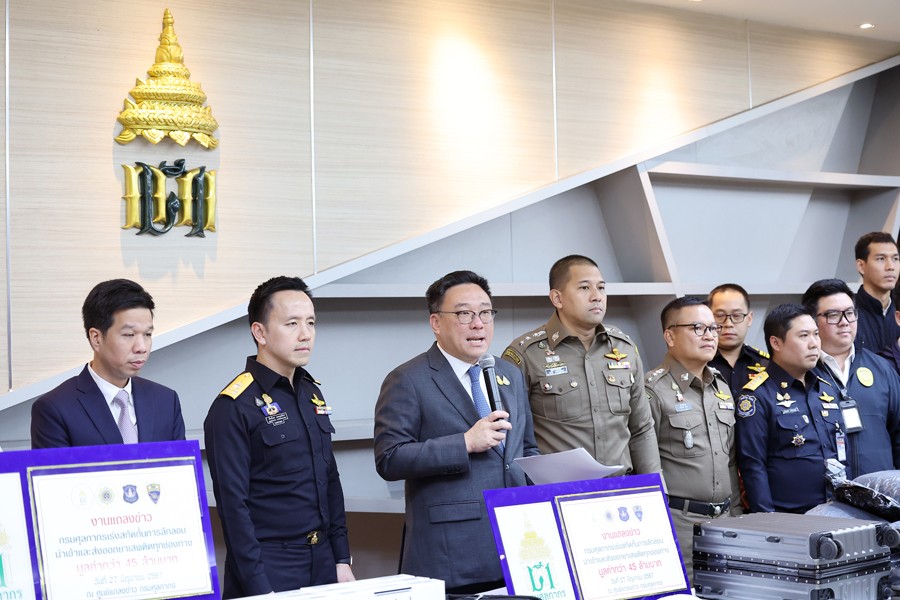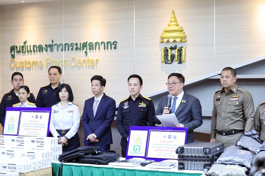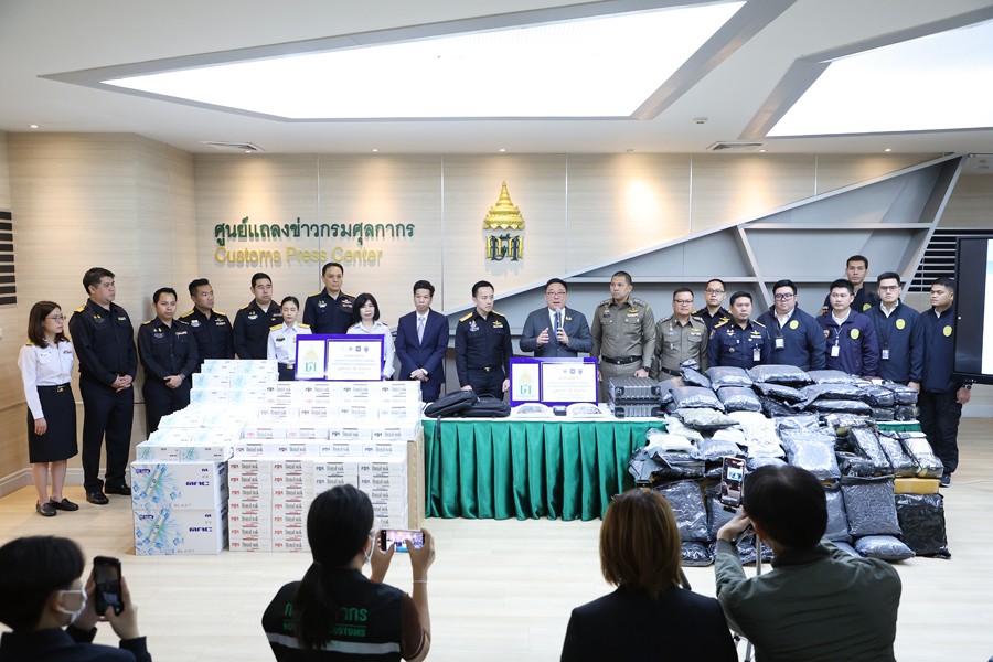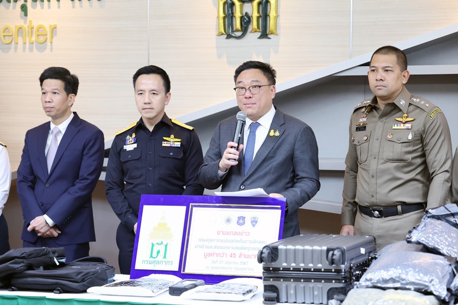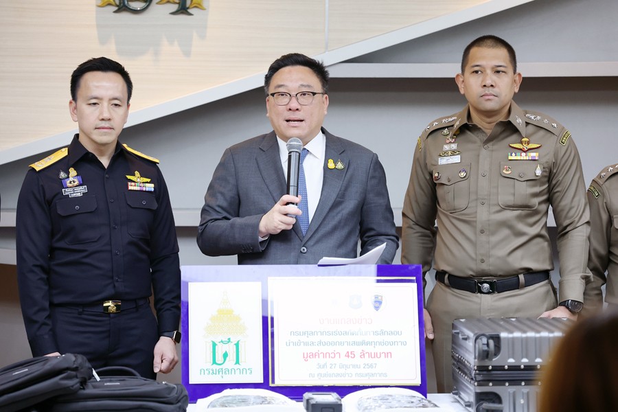 นายจุลพันธ์ อมรวิวัฒน์ รัฐมนตรีช่วยว่าการกระทรวงการคลัง นายสุรชาติ เทียนทอง ที่ปรึกษารัฐมนตรีช่วยว่าการกระทรวงการคลัง นายพันธ์ทอง ลอยกุลนันท์ ที่ปรึกษา ด้านการพัฒนาและบริหารการจัดเก็บภาษี นางสาวนิตยา เที่ยงตรงภิญโญ ผู้อำนวยการสำนักงานศุลกากร ตรวจของผู้โดยสาร นายวรพัฒน์ เชาว์วิศิษฐ ผู้อำนวยการกองสืบสวนและปราบปราม นายวิศณุ วัชราวนิช ผู้อำนวยการสำนักงานศุลกากรตรวจสินค้าท่าอากาศยานสุวรรณภูมิ ผู้แทนจากสำนักงานตรวจคนเข้าเมือง ผู้แทนจากสำนักงานคณะกรรมการป้องกันและปราบปรามยาเสพติด ผู้แทนจากกองบัญชาการตำรวจปราบปราม ยาเสพติด ร่วมแถลงข่าว กรมศุลกากรเร่งสกัดกั้นการลักลอบนำเข้าและส่งออกยาเสพติดทุกช่องทาง รวมมูลค่ากว่า 42.53 ล้านบาท ณ ศูนย์แถลงข่าว ชั้น 2 อาคาร 1 กรมศุลกากร เมื่อวันที่ 27 มิถุนายน 2567