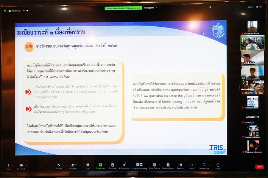 นายธีรลักษ์ แสงสนิท ผู้ตรวจราชการกระทรวงการคลัง เป็นประธานการประชุมคณะอนุกรรมการตัดสินรางวัลทุนหมุนเวียนดีเด่น ครั้งที่ 1/2567 เพื่อร่วมพิจารณาการกำหนดประเภทรางวัล จำนวนรางวัล กรอบหลักเกณฑ์การตัดสินรางวัลทุนหมุนเวียนดีเด่น ประจำปี 2567 – 2569 และพิจารณาทุนหมุนเวียนที่ได้รับรางวัลทุนหมุนเวียนดีเด่น ประจำปี 2567 โดยมีนางแพตริเซีย มงคลวนิช อธิบดีกรมบัญชีกลาง นางภัทรพร วรทรัพย์ ที่ปรึกษาด้านพัฒนาระบบการเงินการคลัง ผู้ทรงคุณวุฒิ และผู้แทนหน่วยงานที่เกี่ยวข้อง ร่วมการประชุม ณ ห้องประชุม 303 กรมบัญชีกลาง และออนไลน์ผ่านระบบ Zoom Meeting เมื่อวันที่ 28 ตุลาคม 2567