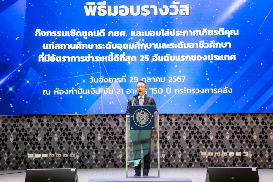 นายลวรณ แสงสนิท ปลัดกระทรวงการคลัง ในฐานะประธานกรรมการกองทุนเงินให้กู้ยืมเพื่อการศึกษา เป็นประธานในพิธีมอบรางวัลกิจกรรมเชิดชูคนดี กยศ. ประจำปีงบประมาณ พ.ศ. 2567 ให้แก่นักเรียน นักศึกษา ศิษย์เก่า กยศ. และสถานศึกษา ผู้ที่เป็นต้นแบบที่ดี (Role Model) ด้านจิตสาธารณะ พร้อมจัดพิธีมอบโล่ประกาศเกียรติคุณแก่สถานศึกษาระดับอุดมศึกษา 25 แห่ง และระดับอาชีวศึกษา 25 แห่ง ที่มีอัตราชำระหนี้ดีที่สุดของประเทศ โดยมีนายชัยณรงค์ กัจฉปานันท์ ผู้จัดการกองทุนเงินให้กู้ยืมเพื่อการศึกษา กล่าวรายงาน ณ ห้องกำปั่นเงิน ชั้น 21 อาคาร 150 ปี กระทรวงการคลัง เมื่อวันที่ 29 ตุลาคม 2567