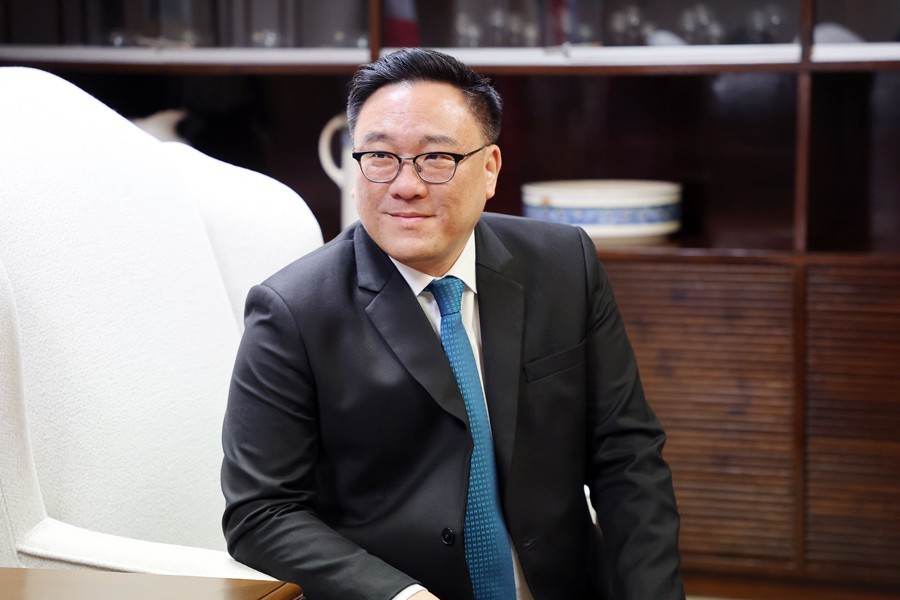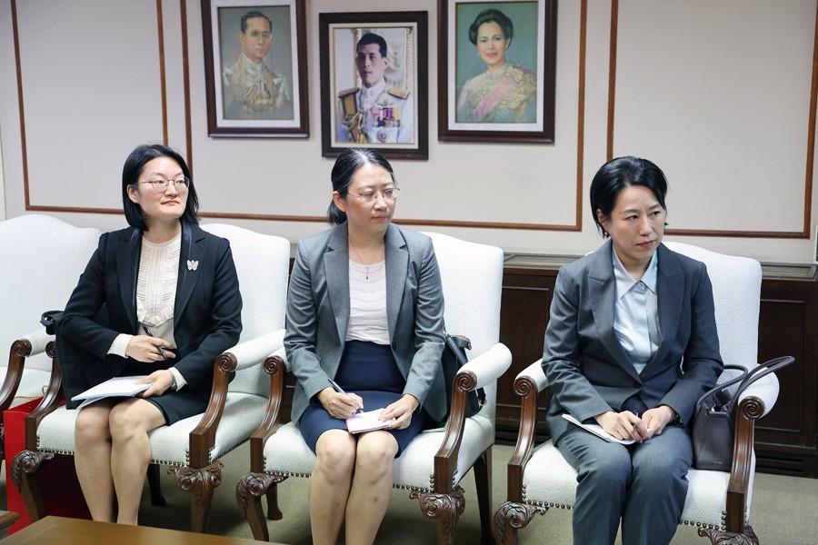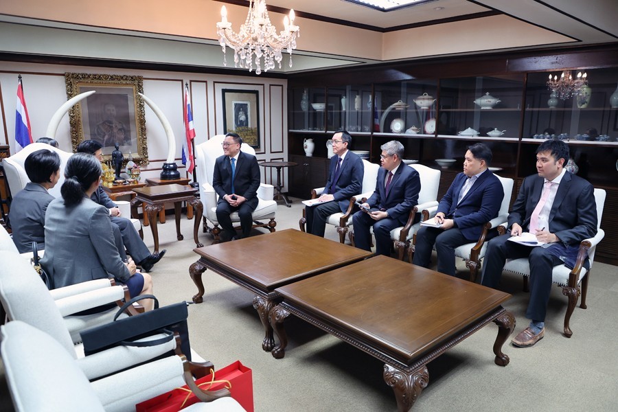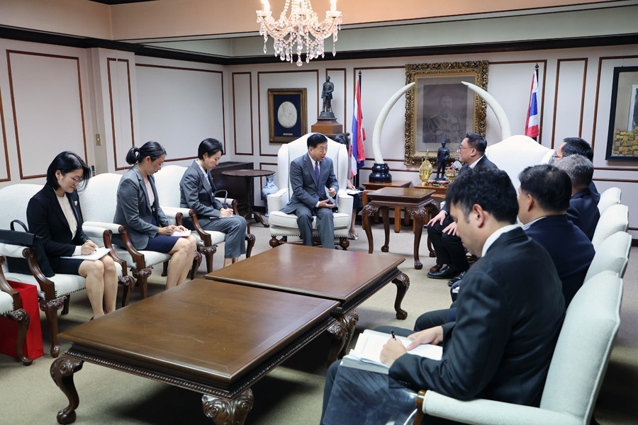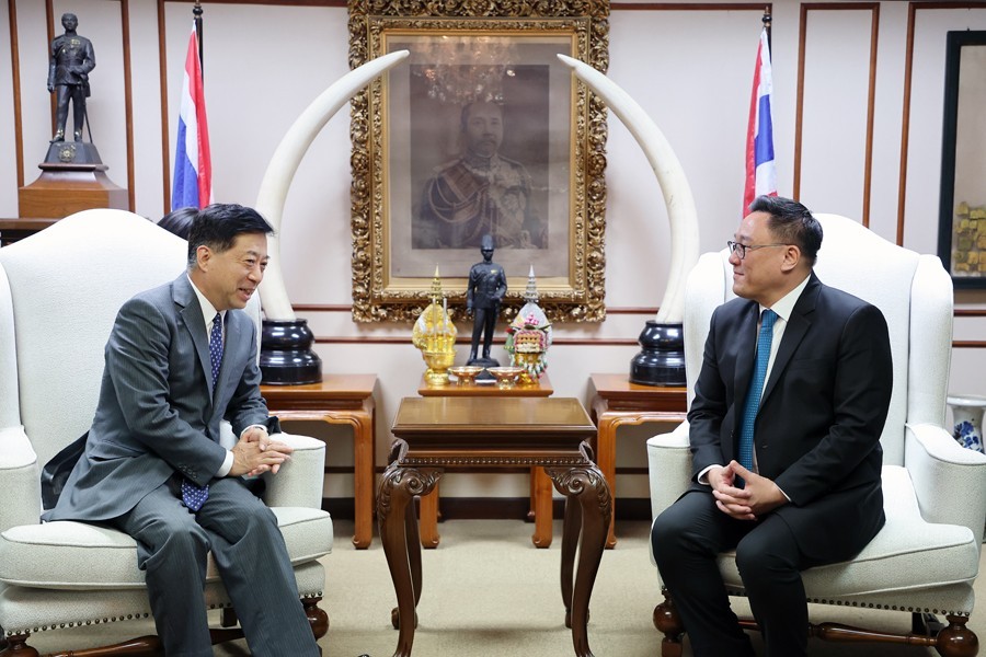 H.E.Mr. Julapun Amornvivat, Deputy Minister of Finance welcomed H.E. Mr. Han Zhiqiang, Ambassador Extraordinary and Plenipotentiary of the People’s Republic of China to Thailand, who paid a courtesy visit and discussed government matters at an executive lounge, April 25, 2024.